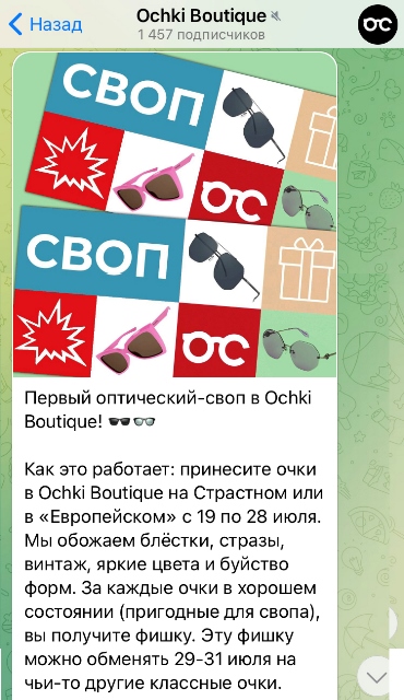 Летом 2022 года команда Ochki Boutique придумала и провела первый в России «оптический своп» — обмен очками. Прирост продаж в результате акции составил +45%.