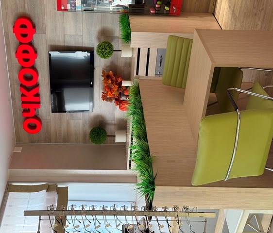 Все подчинено единому стилю, который отражен в логотипе. Это сочетание цветов здоровья: красный, желтый, зеленый, голубой. Поэтому и интерьер торгового зала, и мебель в торговом зале и форма сотрудников, пакеты все сделано в той же цветовой гамме.